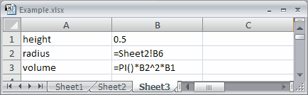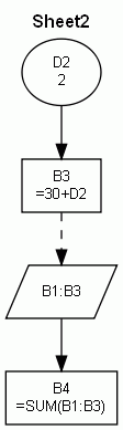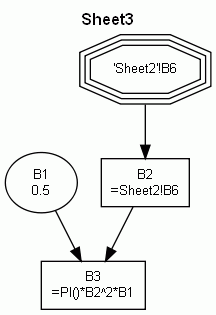 Cell B3 contains the formula "=30+D2", so it is drawn as a box. Cell B3 is also a part of the cell range B1:B3, so a dashed arrow is drawn from it to the parallelogram for cell range B1:B3. As cell B3 refers to cell D2, an arrow flows from ellipse node D2 to box node B1. As cell B1 and B2 are unreferenced by other cells other than by cell B4, no ellipse nodes are drawn for cells B1 and B2. External links refer to references to cells located in another worksheet or workbook. Consider the following example in worksheet "Sheet3" In "Sheet3", cell B3 refers to cells B1 and B2 to calculate the volume. However, cell B2 refers to cell B6 located in "Sheet2" for the radius value. In this case, Trace now draws the following graph: