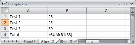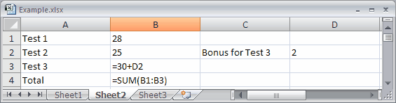 Cell B4 sums the values in cells B1:B3, and Trace produces the following graph: The cell range B1:B3 is depicted as a parallelogram node. The reason for this is a cell range may encompass many cells, so drawing a node for each cell for that range could clutter the graph, making it more difficult to read and understand the various cell relationships. This is especially true for large graphs. However, if we have the following case: In cell D2, a bonus of 2 points was awarded for Test 3 (cell B3), and Trace will now produce the following graph:
