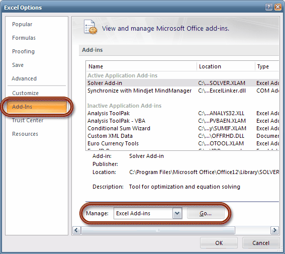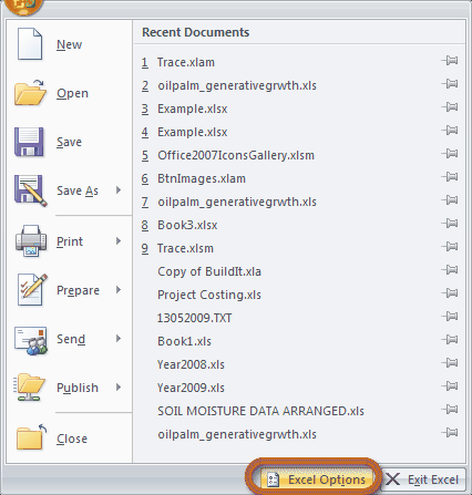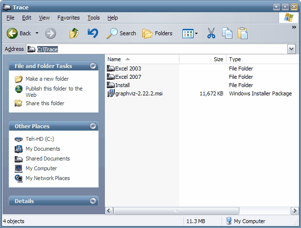 Unpacking Trace archiveUse Windows Explorer to find and double click the Trace.zip file. Unpack the contents in any location you wish (Figure 1). I recommend that you save Trace files in a separate folder, e.g., "C:\Trace\". Figure 1. Suggested location for Trace files Folder Excel 2003 stores Trace for Excel 2003, and folder Excel 2007 for Trace for Excel 2007 onwards. Folder Install contains files for displaying help on installing Trace, including this file. Also included is the Graphviz setup file. Again, you are advised to check Graphviz download site for the latest version. The setup file included here may not be the latest version by the time you read this. Installing Trace Add-in in ExcelInstalling in Excel 2007Click the Office button (Figure 2), and choose Excel Options (Figure 3). Figure 2. Excel's Office button Figure 3. Choose Excel Options You will then be presented with a list of Excel's options. Click Add-Ins, and under Manage, choose Excel Add-ins, and click the Go... button (Figure 4).