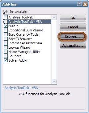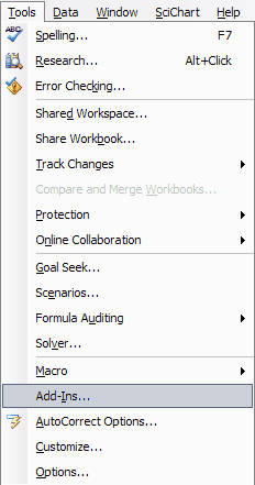 Figure 4. Manage Add-ins You will be presented with another list. This list contains all the add-ins recognised by Excel (Figure 5). If you have saved Trace's files in the default add-in location, you will see the name Trace on this list (Figure 6). However, if you do not see Trace on this list (i.e., name missing), do not worry. It only means that you have saved Trace in a non-default location. Click the Browse... button (Figure 5) to specify Trace's location/folder (e.g., C:\Trace) to Excel. Once you have found Trace's location, you will see Trace's name on the list (Figure 6). Ensure the check mark appears next to Trace's name. Figure 5. List of Add-ins Figure 6. Trace on the list of add-ins. Ensure Trace's check box is ticked. Click the OK button (Figure 6), and once installed, Trace's menu will appear on the Ribbon (Figure 7). Trace is now ready to use each time you open Excel. Figure 7. Trace's menu on Excel's Ribbon Installing in Excel 2003On the main menu bar, click Tools and then Add-Ins... (Figure 8). Figure 8. Managing the add-ins in Excel 2003 You will see a list of add-ins recognised by Excel (Figure 5). If you have saved Trace's files in the default add-in location, you will see the name Trace on this list (Figure 6). However, if you do not see Trace on this list (i.e., name missing), do not worry. It only means that you have saved Trace in a non-default location. Click the Browse... button (Figure 5) to specify Trace's location/folder (e.g., C:\Trace) to Excel. Once you have found Trace's location, you will see Trace's name on the list (Figure 6). Ensure the check mark appears next to Trace's name. Click the OK button (Figure 6), and once installed, Trace's menu will appear on the main menu (Figure 9). Trace is now ready to use each time you open Excel. Figure 9. Trace's menu on Excel 2003 main menu Installing GraphvizDouble click the graphviz's setup file (e.g., graphviz-2.22.2.msi), and follow the instructions. Christopher Teh Boon Sung, Serdang |