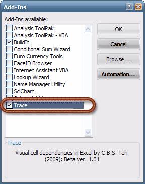 Pre-requisitesTrace is an add-in that works only in Microsoft Excel version 2003 onwards (including version 2007). Additionally, Trace works only in the Microsoft Windows operating system. Trace also requires Graphviz software from AT&T Research Lab to work. The Graphviz setup file is included in the Trace archive file, but it is recommended that you check Graphviz's website for the latest version. This is to ensure you will obtain the latest version of Graphviz, which may have improvements in speed and bug fixes. Graphviz can be downloaded for free from: http://www.graphviz.org/Download_windows.php. Ensure you download the Graphviz for Windows version. Steps to install: